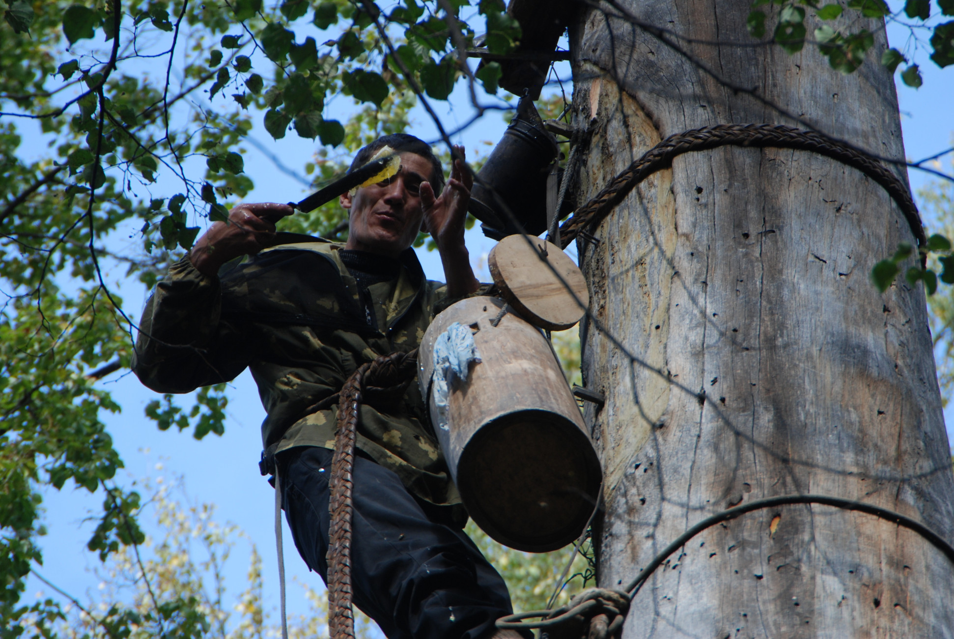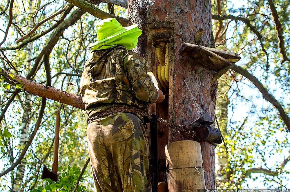 Жизнь в борти - естественном дупле. Мы не используем рамочные ульи. Наши пчёлы живут в бортьях - специально выдолбленных дуплах в живых деревьях на высоте 4-15 метров в глухом лесу. Здесь они сами отстраивают соты и живут по естественным законам природы.