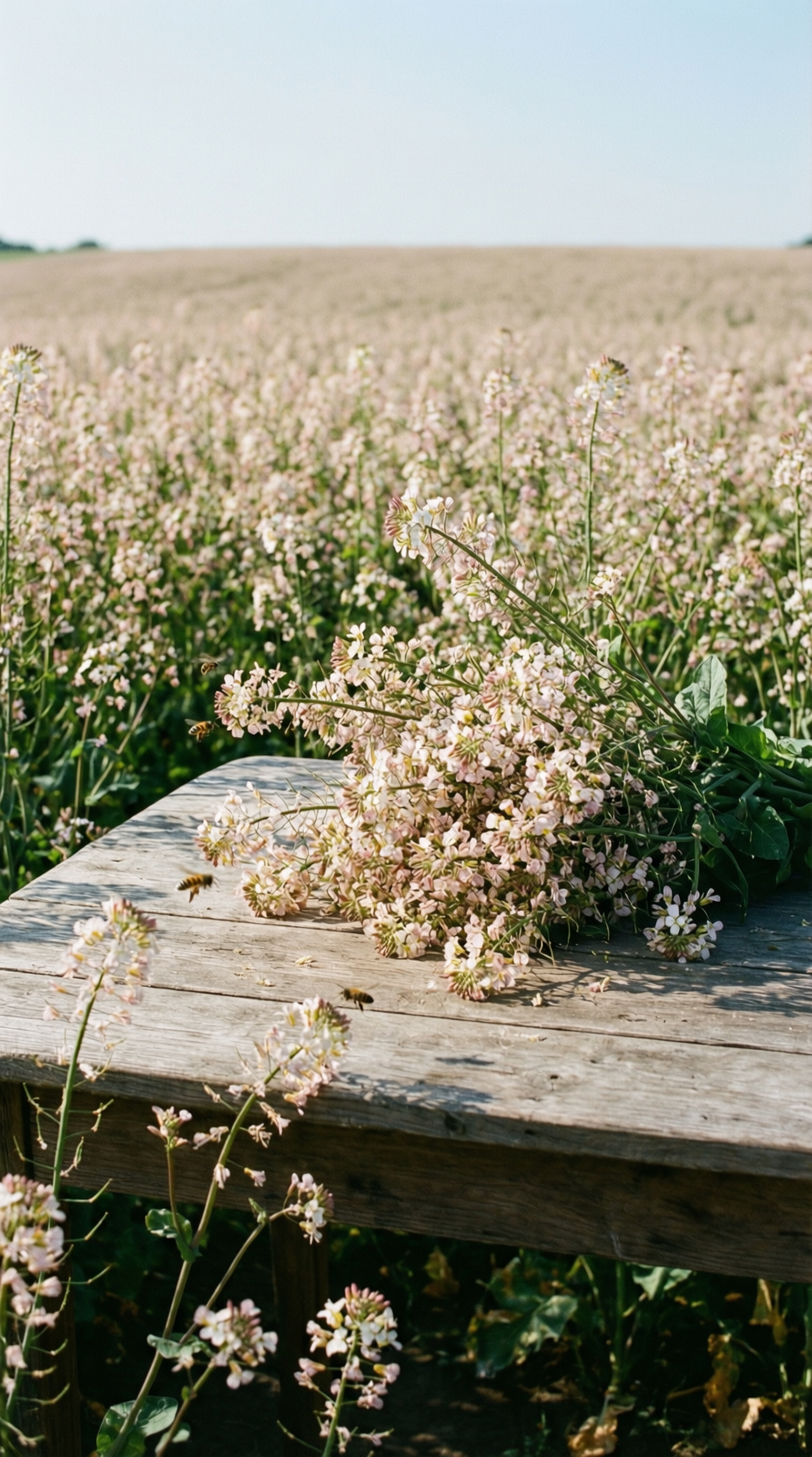 Сбор нектара на цветущих гречишных полях. Наши пасеки специально вывозятся в период цветения гречихи, что позволяет пчёлам собирать нектар с этого ценного медоноса. Так мы получаем чистый, монофлорный гречишный мёд с максимальной концентрацией его уникальных свойств.