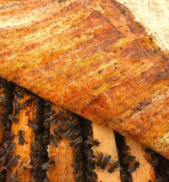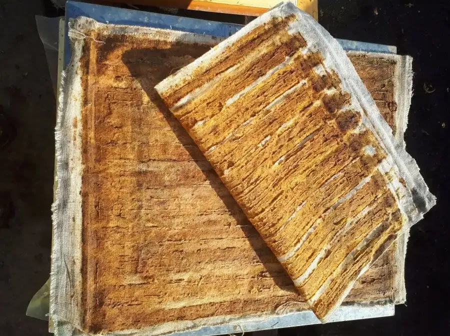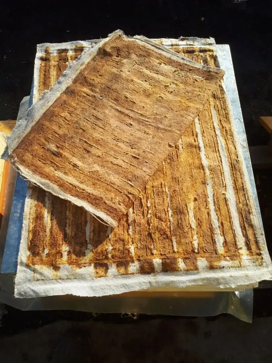 Естественная пропитка в улье. Мы помещаем чистые льняные холсты под крышку улья. Пчёлы, стремясь заделать щели и регулировать микроклимат, покрывают ткань прополисом, воском и другими антисептическими веществами, превращая её в уникальный биоматериал.