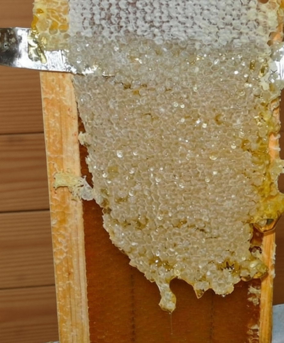 Аккуратный срез забруса вместе с верхним слоем мёда. Чтобы получить этот ценный продукт, мы не используем медогонку. Мы вручную, специальным ножом, аккуратно срезаем верхнее запечатанные крышечки сот вместе с небольшим количеством мёда, который находится непосредственно под ним.